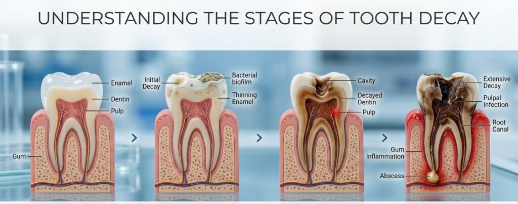 Tooth decay doesn’t happen overnight. It’s a gradual process that typically occurs in stages: